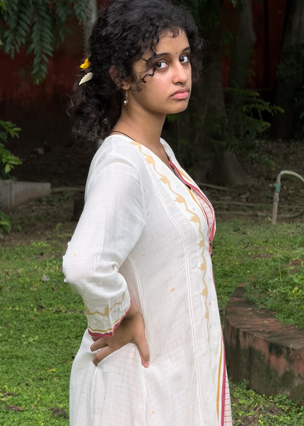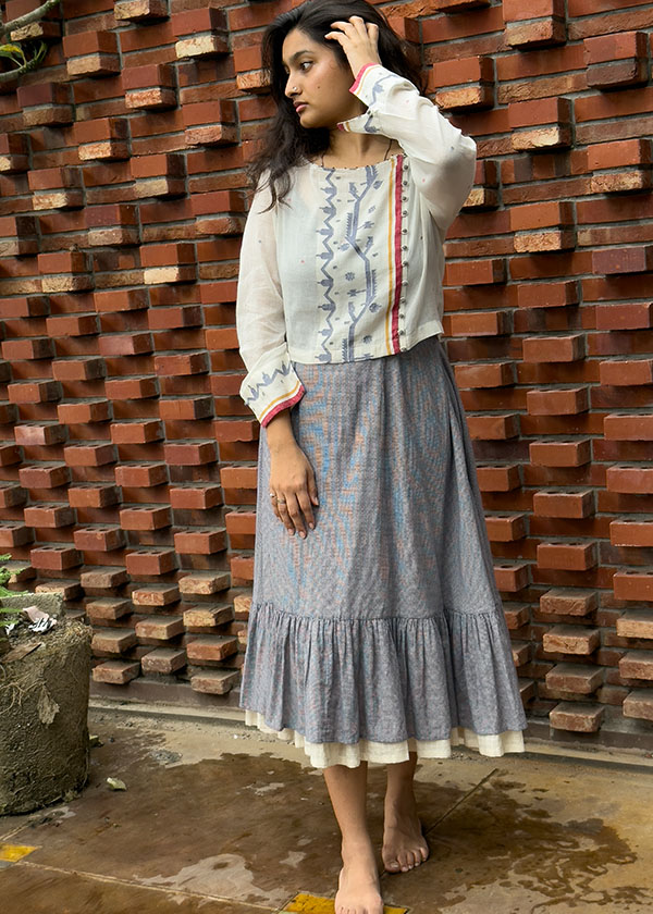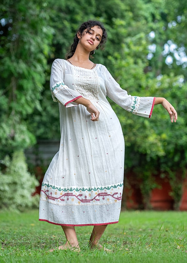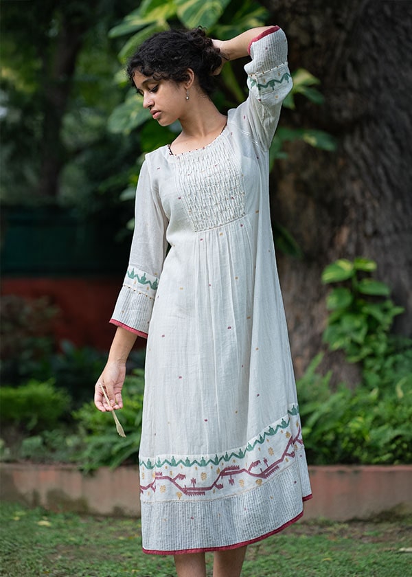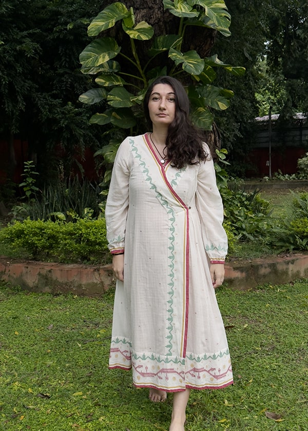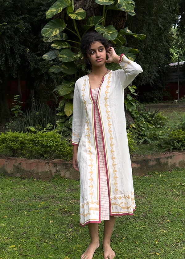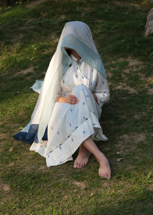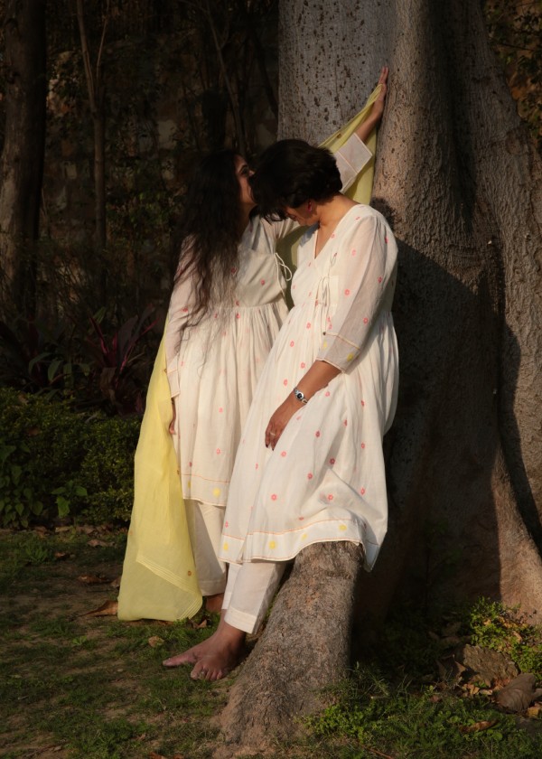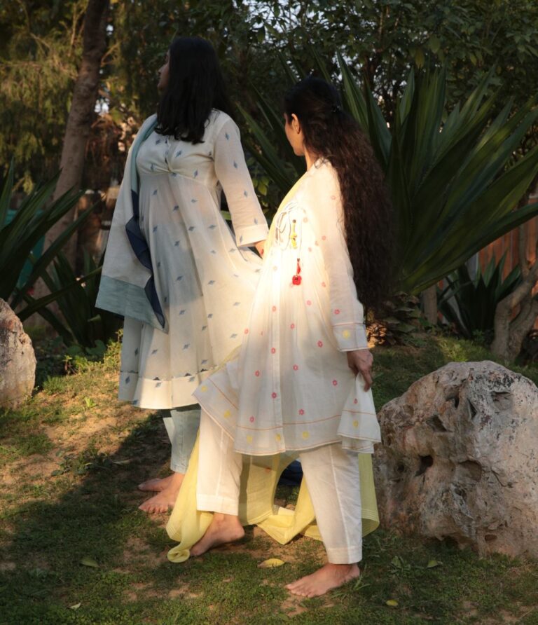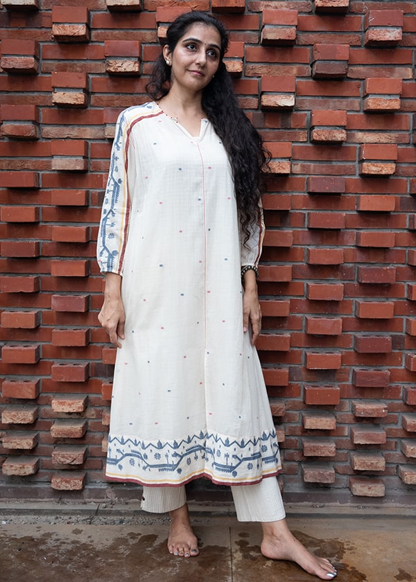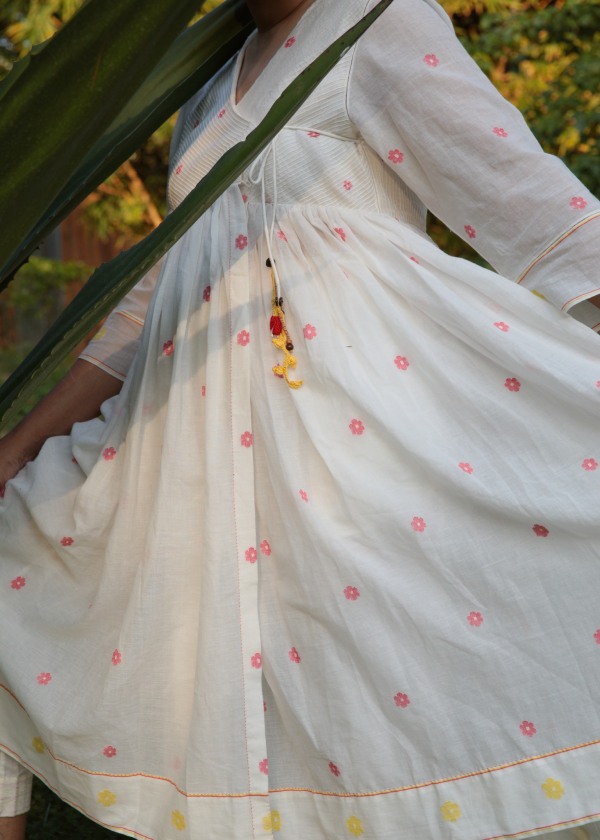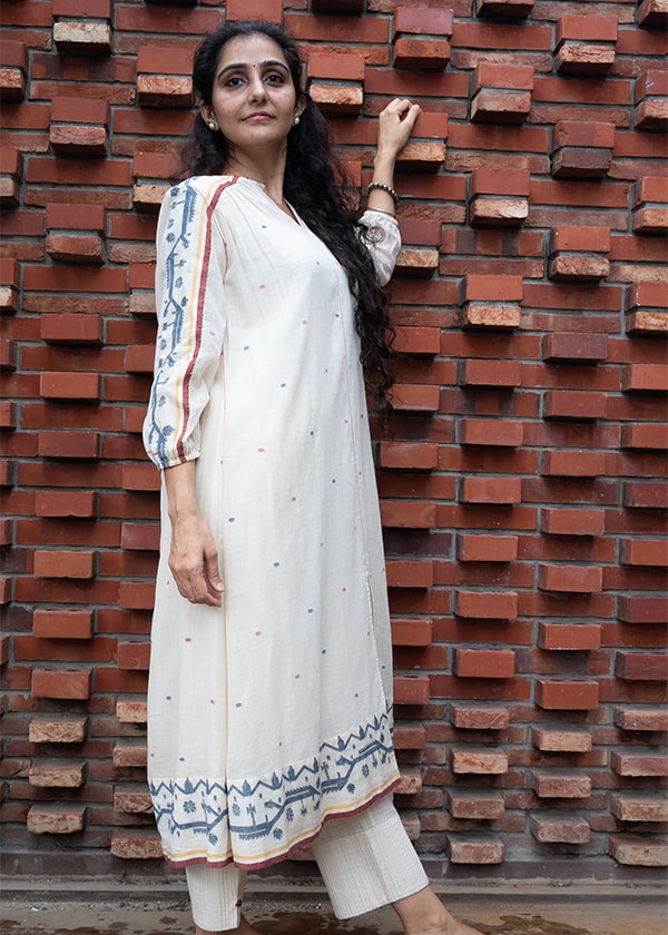 Our Just Jamdani collection has angrakha kurtas with gentle motifs in fine white muslin Jamdani from Bengal, which are ethereal and oh-so light to wear during the hot summer months. This is a premium range with only three different kurta styles at present. But do watch out for more in our unique muslin collection from this increasingly rarefied breed of khadi muslin weavers from West Bengal.