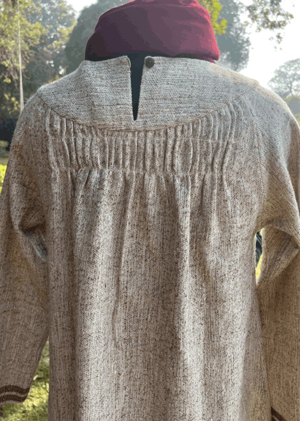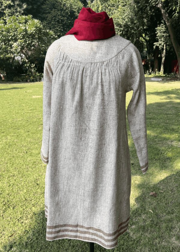 Beige white yak and angora wool blend hand woven with striped borders has been tailored into a tunic with delicate gathers around the yoke.