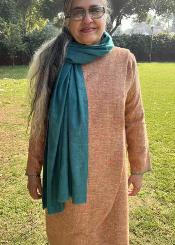 Saffron and white yak and angora wool blend is custom handwoven in a diamond weave pattern. The fabric has been tailored into a cozy wrap around tunic with khadi cotton lining; snug and stylish for cold winter days.