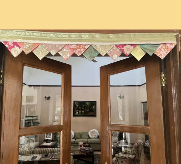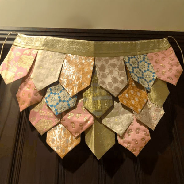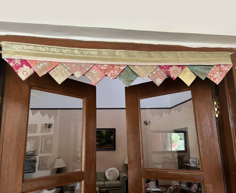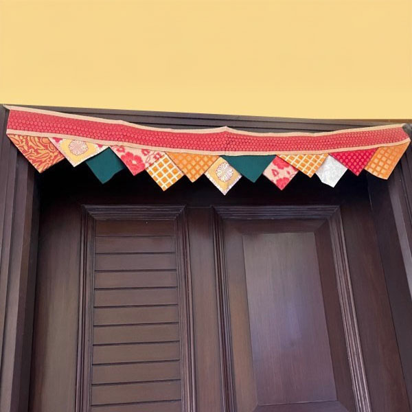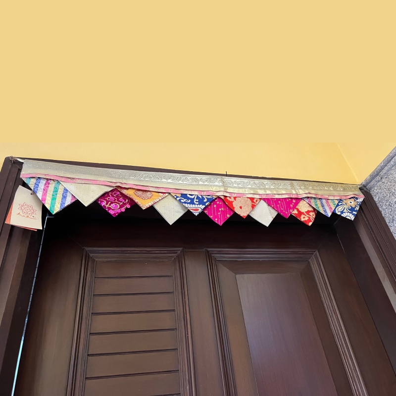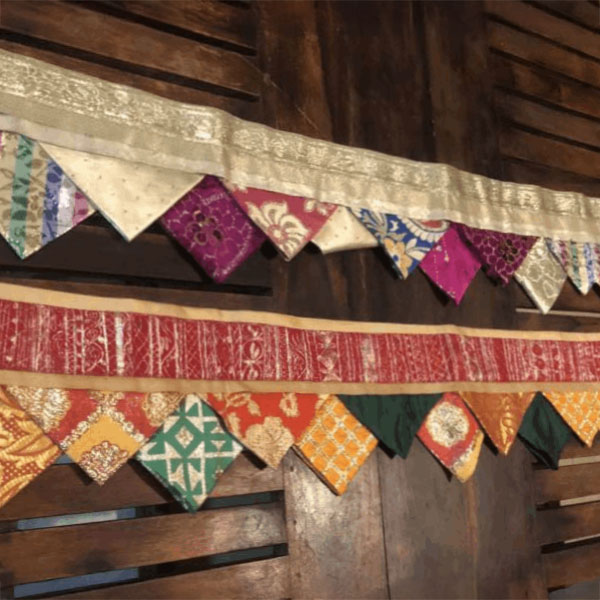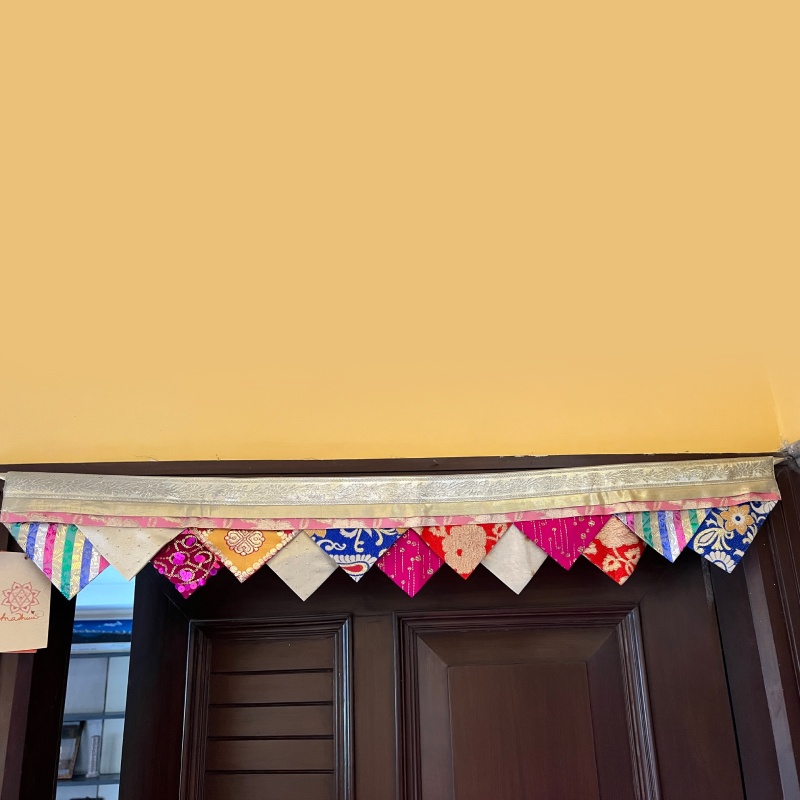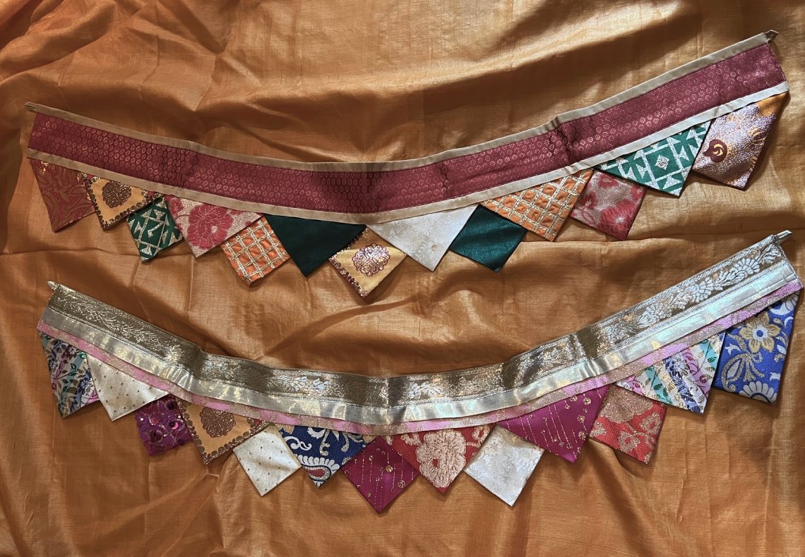 Our up-cycled range of Rumala Torans are colourful, festive and glitzy buntings made from old Rumala sahibs (sacred cloth) used to clothe the holy Guru Granth Sahib. These discarded cloth are collected and carefully mixed and matched to come together into unique torans (buntings) which can adorn our doorways on special poojas or celebrations.